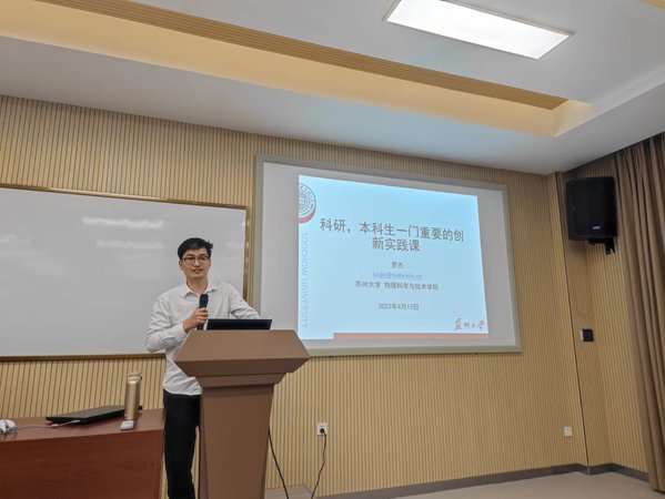 为了进一步提升学生创新实践能力,4月13日晚,光学与电子信息学院在国际交流学院301举办创新训练营第一期第一讲。苏州大学物理科学与技术学院罗杰副教授主讲,主题为 “科研——本科生一门重要的创新实践课”。光学与电子信息学院团学工作办公室郭浩主持,在研项目全体成员、2021级学生代表、22书院(工科基地班)全体同学参加了本次培训。