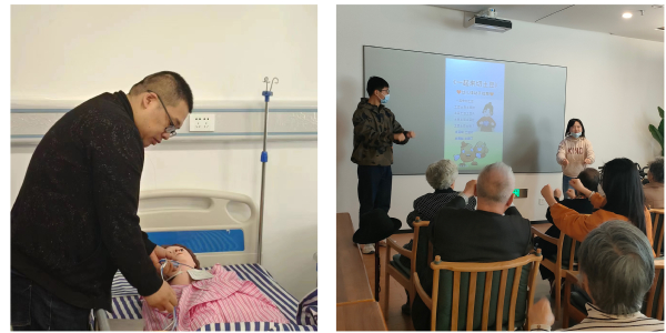 了解了机构的运营情况后,开启了本次教学实践活动,同学们被分为了两组。一组前往苏康养老年医院进行《救护学》课程学习,老年医院康复科负责人张新伟老师向大家介绍了心肺复苏的基本要领和救护康复辅助器具的种类,以及如何使用这些器具。另一组同学则是留在魅力花园公寓中,为长者开展了一次志愿活动。20劳保学生汪赛曌向长者们介绍了手势舞“一起来切土豆”的动作要领,12位同学分散坐在老人身边,和老人一起跟随音乐做手势舞,帮助老人们锻炼机体协调能力。