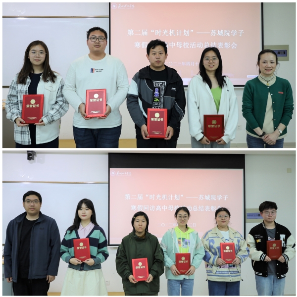 宋丹和袁羽琮分别为第二届“时光机计划”——苏城院学子寒假回访高中母校活动的获奖同学进行颁奖。