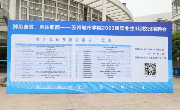 为深入学习宣传贯彻党的二十大精神,认真落实党中央、国务院“稳就业”“保就业”决策部署,抢抓春季促就业关键期,全力助推我校2023届毕业生顺利就业、尽早就业,我校于4月18日下午在学生活动中心一楼举办“踔厉奋发,勇往职前”苏州城市学院2023届毕业生4月校园招聘会。