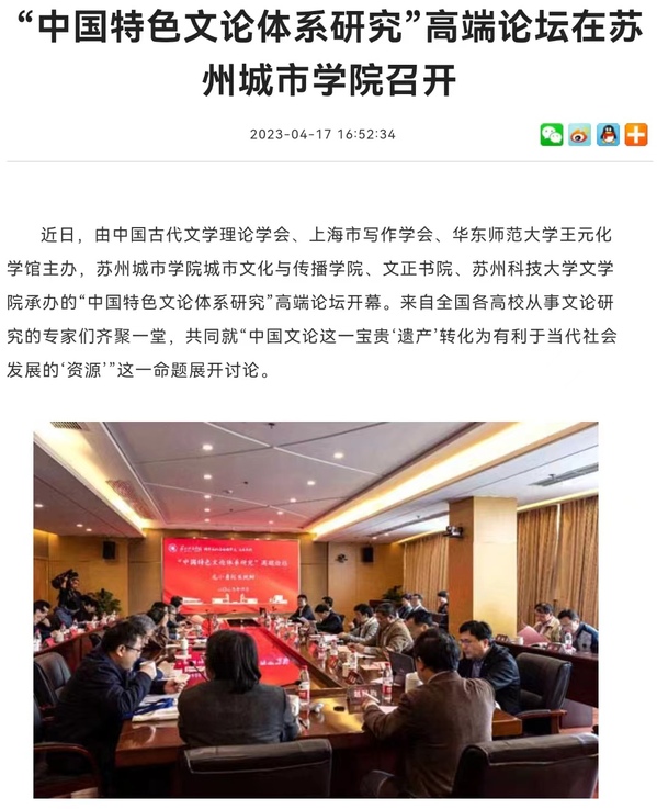 近日,由中国古代文学理论学会、上海市写作学会、华东师范大学王元化学馆主办,苏州城市学院城市文化与传播学院、文正书院、苏州科技大学文学院承办的“中国特色文论体系研究”高端论坛开幕。来自全国各高校从事文论研究的专家们齐聚一堂,共同就“中国文论这一宝贵‘遗产’转化为有利于当代社会发展的‘资源’”这一命题展开讨论。