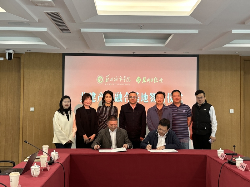 为了进一步深化产教融合、推动校企合作,提升新文科人才综合素养培养水平,4月27日,城市文化与传播学院在苏州新闻大厦与苏州日报社举行产教融合基地签约仪式。苏州日报社党委副书记、总编辑常新,党委委员姚喜新,融媒编委会秘书长孟海龙,编辑中心总监宋治国,视频视觉融媒体中心总监蒋恺,数创融媒体中心总监王璟晋,城市文化与传播学院外语系主任孙少华,苏州大学传媒学院副教授王静及相关专业教师参加签约。