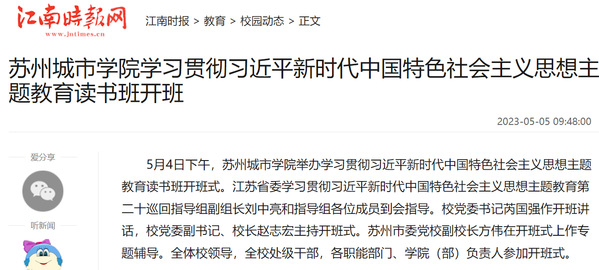 “举办专题读书班,是持续推动我校主题教育走深走实,引导党员干部深入学习贯彻习近平新时代中国特色社会主义思想的重要路径。”苏州城市学院校长赵志宏表示,学校要切实办好主题教育读书班,不断提高政治站位,充分认识举办读书班的重要意义,全面学习领会习近平新时代中国特色社会主义思想,特别是习近平总书记关于教育的重要论述。他强调,学校已步入转设转型提升的关键阶段,我们必须坚持以习近平新时代中国特色社会主义思想为指导,全面贯彻党的教育方针,紧紧围绕立德树人根本任务,锚定学校“十四五”规划目标任务,进一步夯实国内一流高水平应用型大学建设基础,为全面推进中国式现代化苏州新实践作出更多更大的贡献。