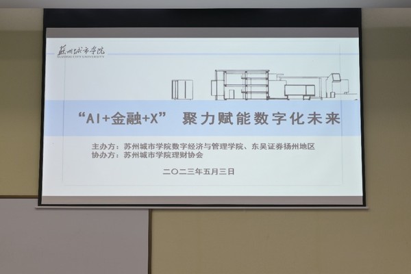 为使大学生了解AI人工智能技术在证券投资中的应用和发展趋势,5月3日,数字经济与管理学院携手东吴证券股份有限公司,于3-201教室成功举办“AI+金融+X 聚力赋能数字化未来”专题讲座。此次讲座由东吴证券资深投资顾问包盟主讲,东吴证券扬州分部总经理王红叶、数字经济与管理学院社团指导老师秦畅到会指导,学院200余名师生现场参与。