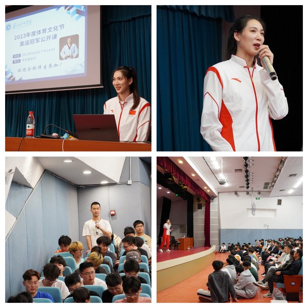 随后,2016年里约奥运会跆拳道女子67公斤级冠军、新加坡青奥会冠军、2次全运会冠军、8次世界大奖赛冠军、7次世界杯冠军得主郑姝音为全体师生上了一堂生动的公开课。郑姝音从梦想、拼搏、感恩、荣光四个方面讲述了自己逐梦奥运的运动生涯,分享了冠军之路的艰辛与不易,表达了对祖国、团队、亲友的感激之情以及为国争光的骄傲与自豪。“不啻微芒,造炬成阳”,她鼓励青年学子要持之以恒,珍惜每一点收获与进步,积跬步至千里,积小流成江海。