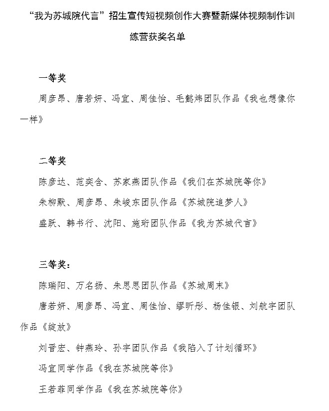 本次活动以赛促学,以赛促宣,展示了学校风貌和学生青春风采,提升了短视频制作技能,营造了积极参与网络文化作品创作生产的良好氛围。大赛优秀作品在本学年招生季将通过学校抖音视频号、招生宣传等平台进行展播,用短视频讲好苏城院故事,传播苏城院形象。