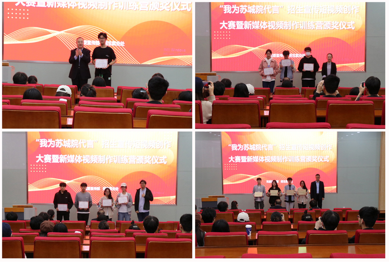 本次活动共收到23项个人及团队参赛作品。作品内容主题丰富,包含“我为苏城院代言”“苏城院追梦人”“我在苏城院等你”等,作品形式多样,涵盖记录式VLOG、剧情短片、介绍校园生活的宣传片等。部分优秀作品在颁奖仪式现场进行展播。