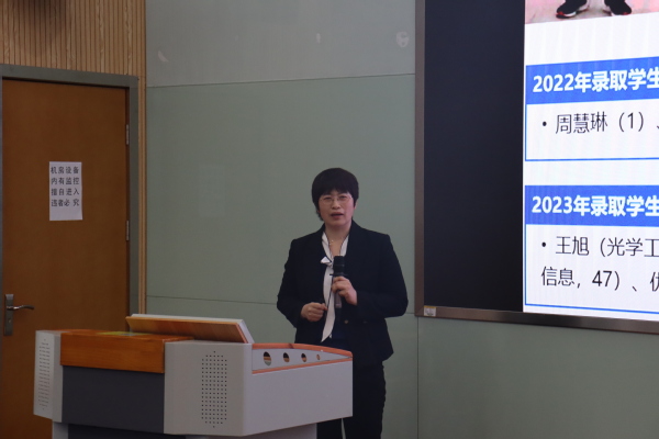 陈淑芬围绕南京邮电大学材料科学与工程学院的发展历史沿革、师资队伍状况、学科平台及建设、科研成果、合作交流、学生就业和研究生招生培养等情况与参会师生进行了交流。同时,她还介绍了近年来南京邮电大学材料科学与工程学院录取光学与电子信息学院学生的情况,并鼓励同学们积极报考。