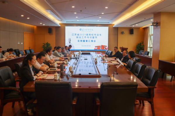 为全面贯彻落实党中央、国务院和省委、省政府关于做好高校毕业生就业工作的决策部署,根据省政府教育督导委员会办公室《关于印发<江苏省2023届普通高校毕业生就业工作专项督导实施方案>的通知》要求,5月18日下午,省政府教育督导委员会办公室第九督查组一行到我校督导检查2023届毕业生就业工作情况。省督学、南京师范大学原党委书记胡敏强担任组长,成员包括扬州大学就业指导中心主任陈轶群、省高校招生就业指导服务中心认证服务部部长郭睿。党委书记芮国强,党委副书记、校长赵志宏,党委常委、副校长吴昌政,就业工作领导小组成员、招生就业处全体人员参加,会议由胡敏强主持。
