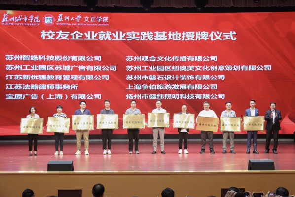 吴昌政为校友企业就业实践基地授牌,参加授牌仪式的校友企业有:苏州智绿科技股份有限公司、苏州观合文化传播有限公司、苏州工业园区纽奥美文化创意策划有限公司、苏州工业园区苏城广告有限公司、江苏新优程教育管理有限公司,苏州市磐石设计装饰有限公司、江苏法略律师事务所、上海争伯旅游发展有限公司、宝原广告(上海)有限公司、扬州市健纬照明科技有限公司。校友企业就业实践基地的建立,是校企之间的深度合作,也是学校与各位校友进一步联系的桥梁,希望通过基地建设,一起推动形成产教良性互动、校企优势互补的发展格局。