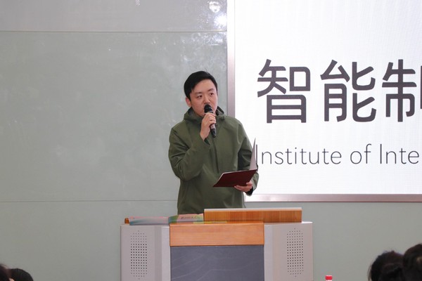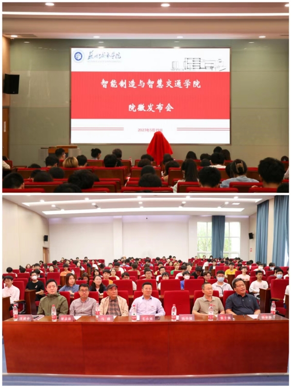 院徽设计者沈致中对院徽的设计理念和内涵进行讲解。院徽由白绿蓝三色组成,图案的中间是对称的齿轮形状符号。他从契合领域属性、服务地方功能、进取发展精神三个角度寻找设计灵感。工科的齿轮图形作为标志的主要特征;沉稳的蓝色和绿色作为主基调,象征着智能、创新和可持续发展蓝图;斜切弧面展现出趋势感和未来感。从解构分析来看,概念化符号化的银杏形状融合了苏州当地的人文底蕴和地域情怀;箭头的符号直指正午十二时这个最阳光最积极的方向,代表着智能制造与智慧交通学院面向世界、面向未来的无限可能。
