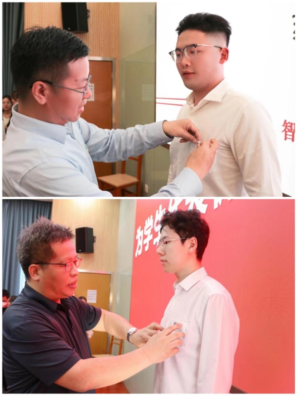随后,教师代表庄重地为学生代表们戴上院徽。