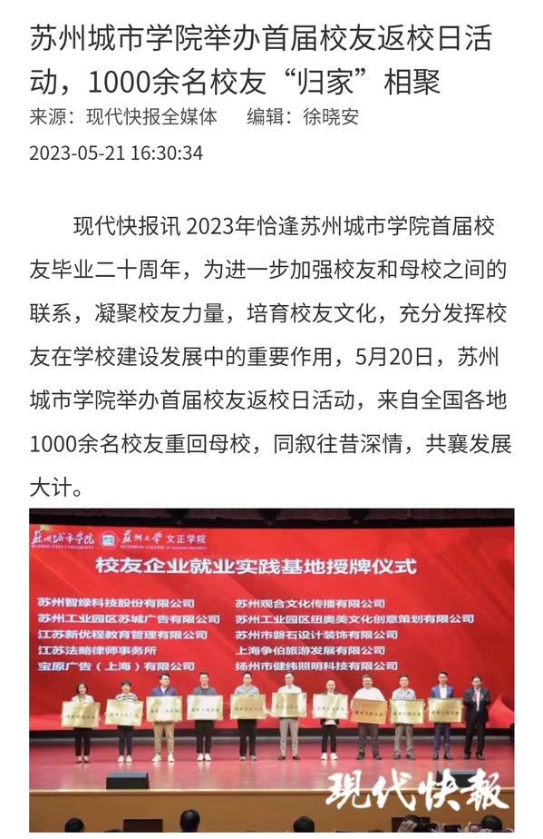 2023年恰逢苏州城市学院首届校友毕业二十周年,为进一步加强校友和母校之间的联系,凝聚校友力量,培育校友文化,充分发挥校友在学校建设发展中的重要作用,5月20日,苏州城市学院举办首届校友返校日活动,来自全国各地1000余名校友重回母校,同叙往昔深情,共襄发展大计。