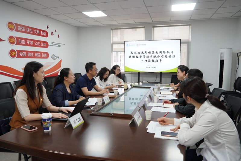 为进一步加强校企合作,深化产教融合,拓宽毕业生就业渠道和资源,5月19日上午,无锡苏南国际机场集团经营管理有限公司总经理董琳,贵宾服务部经理华维敏,综合管理部副经理邹元,综合管理部人事主管徐聃羚等相关人员来设计与艺术学院走访交流。设计与艺术学院党委副书记丁良超,学院航空服务艺术与管理专业负责人熊莹,综合办公室何玉,航空服务艺术与管理专业教师郑天琪,教务科研办赵一蔚等师生参加调研交流。
