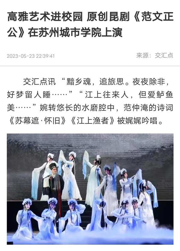 苏州城市学院的前身是苏州大学文正学院,“文正”二字正是取自范仲淹的谥号。苏州城市学院党委常委、党委宣传部部长仲宏介绍,内容上,《范文正公生平事略》以及昆剧《范文正公》突出强调传承弘扬中华优秀文化艺术,形式上采用专家讲学与现场演出相结合、知识普及与艺术欣赏相交融,符合高雅艺术进校园活动“以美育人、以文化人”的根本要求。
