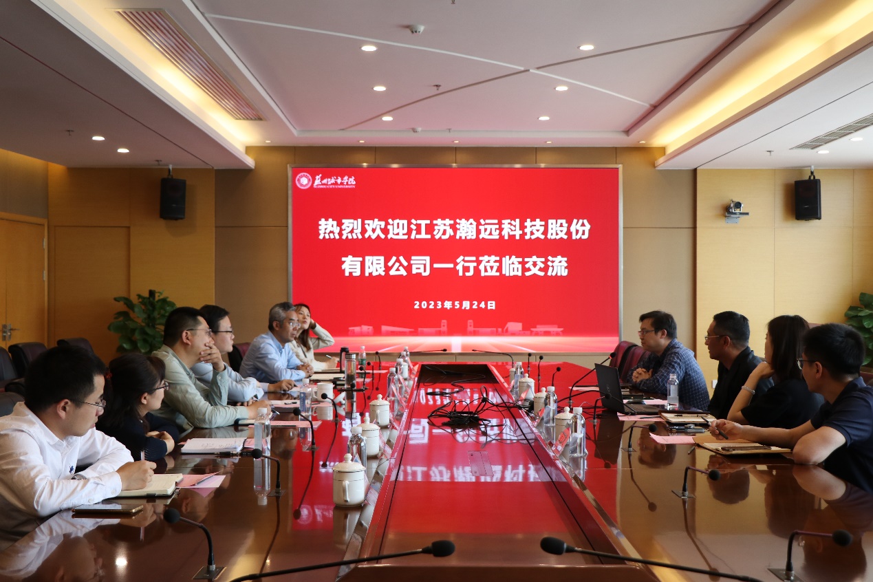 5月24日下午,江苏瀚远科技股份有限公司董事长肖峻涛一行来我校交流,校长赵志宏,党委常委、副校长毛小勇出席交流会,会议由赵志宏主持。