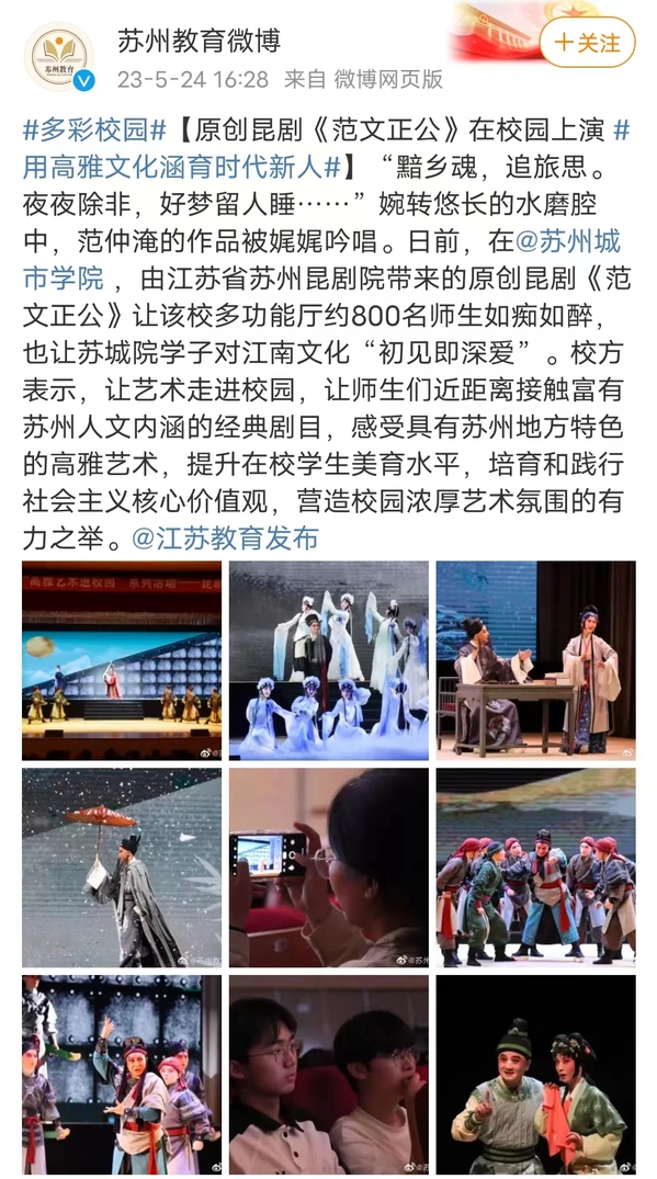 “黯乡魂,追旅思。夜夜除非,好梦留人睡……”婉转悠长的水磨腔中,范仲淹的作品被娓娓吟唱。日前,在苏州城市学院,由江苏省苏州昆剧院带来的原创昆剧《范文正公》让该校多功能厅约800名师生如痴如醉,也让苏城院学子对江南文化“初见即深爱”。校方表示,让艺术走进校园,让师生们近距离接触富有苏州人文内涵的经典剧目,感受具有苏州地方特色的高雅艺术,提升在校学生美育水平,培育和践行社会主义核心价值观,营造校园浓厚艺术氛围的有力之举。