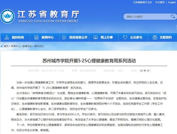 为进一步加强心理健康教育工作,引导学生感悟生命的意义,提高学生敬畏生命、珍爱生命的意识,树立积极的人生态度,近期,苏州城市学院开展了“5· 25心理健康教育周”系列活动。