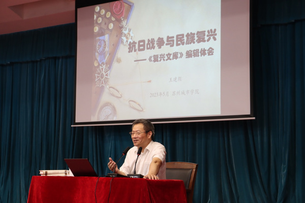 王建朗的专题讲座从《复兴文库》编辑情况简介、抗日战争与中国国际地位的转变、中国共产党在抗日战争中走向成熟三个方面展开讲解。他表示,自己有机会成为《复兴文库》编纂出版工作中的一员,深感荣幸。他强调,中国共产党成立后,团结带领人民前仆后继,进行艰苦卓绝的斗争,坚持马克思主义指导地位,找到了实现中华民族伟大复兴的正确道路,谱写了中华民族发展进程中最为波澜壮阔的历史篇章,中华民族伟大复兴展现出前所未有的光明前景,《复兴文库》用系统的历史文献证明中国共产党是中华民族伟大复兴进程的最重要领导者和推动者,必将在学术文化建设史上留下光辉的记录。