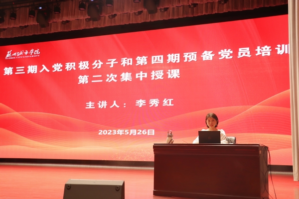 5月26日下午,我校第三期入党积极分子和第四期预备党员培训第二次集中授课在综合楼多功能厅举行。授课由党校饶琼老师主持,苏州城市学院马克思主义学院李秀红老师主讲,主题为:《凝心铸魂创伟业 踔厉奋发向复兴》。