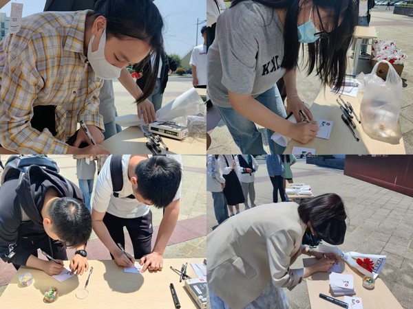 活动中,同学们通过撰写留言卡片或者在展板上留下自己的正能量治愈寄语,即可获得一朵“小红花”,当日累计送出400余朵弗兰花。同学们传递出的一字一句,表达了对自己的勉励与期许,对家人的挂念与祝福,对同学好友的关心与问候,还有很多同学携“小红花”与自己的留言合影留念,活动现场气氛热烈。