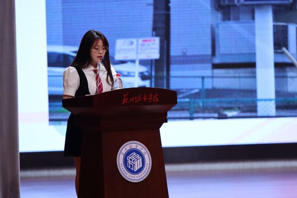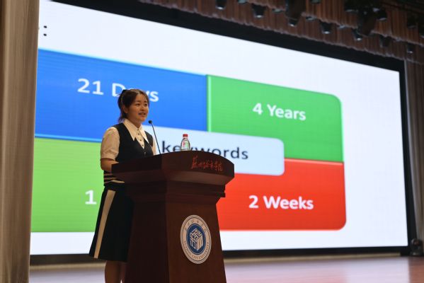 2016级金融联培专业校友冯馨瑶向学生们讲述着自己在台湾东吴大学的交换生经历,她表示大学生的学习生活应该保持轻松愉悦的好心情,用心体验世界的多姿多彩。