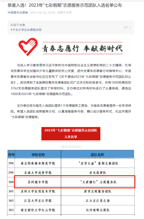 团中央青年志愿者行动指导中心、中国青年志愿者协会秘书处联合发布2023年“七彩假期”志愿服务示范团队,我校“大爱微行”志愿服务团队成功入选。“大爱微行”志愿服务团队由苏州城市学院青年志愿者协会成员组成,团队成员奉行“团结、互助、友爱、进步”的志愿服务精神,扎根苏州,聚焦暑托班学生的具体情况和年龄特征,科学规范设计课程,引导帮助学生树立正确的世界观、人生观和价值观,展现苏城青年的时代担当。