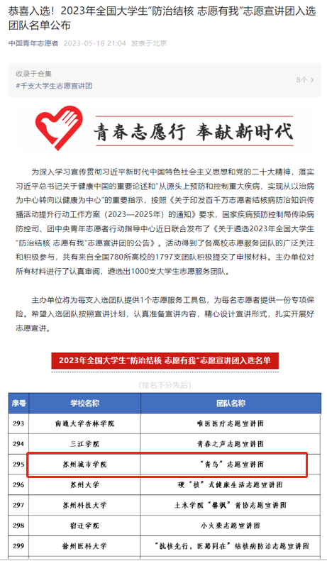 国家疾病预防控制局传染病防控司、团中央青年志愿者行动指导中心联合发布2023年全国大学生“防治结核志愿有我”志愿宣讲团入选名单,我校“青鸟”志愿宣讲团成功入选。“青鸟”志愿宣讲团由光学与电子信息学院学生组成,在学院党委的直接领导和校团委的具体指导下,依托苏州市吴中区疾控中心慢传科,以“奉献、友爱、互助、进步”的青年志愿者精神为指导,开展防治结核志愿活动。团队分为活动策划组、新媒体宣传组、文案组,曾于第28个世界防治结核病日开展“你我共同努力,终结结核流行”主题宣传活动,与吴中区疾控中心开展密切合作。