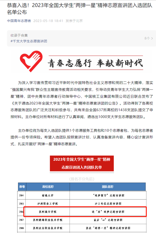 中国核工业集团有限公司、团中央青年志愿者行动指导中心联合发布2023年全国大学生“两弹一星”精神志愿宣讲团入选名单,我校追“星”逐梦志愿宣讲团成功入选。“追‘星’逐梦”志愿宣讲团由城市治理与公共事务学院、城市文化与传播学院和数字经济与管理学院学生组成,依托苏州中小学及本校、社区,以“勇敢、激情、创造、奉献”的精神为引领,开展“两弹一星”志愿宣讲活动。
