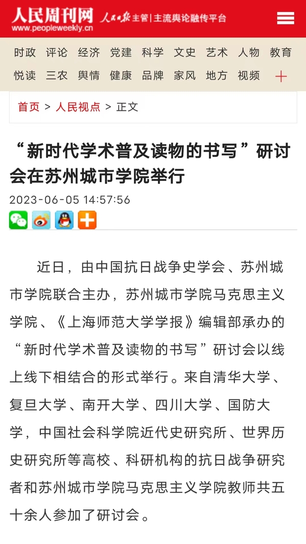 近日,由中国抗日战争史学会、苏州城市学院联合主办,苏州城市学院马克思主义学院、《上海师范大学学报》编辑部承办的“新时代学术普及读物的书写”研讨会以线上线下相结合的形式举行。来自清华大学、复旦大学、南开大学、四川大学、国防大学,中国社会科学院近代史研究所、世界历史研究所等高校、科研机构的抗日战争研究者和苏州城市学院马克思主义学院教师共五十余人参加了研讨会。
