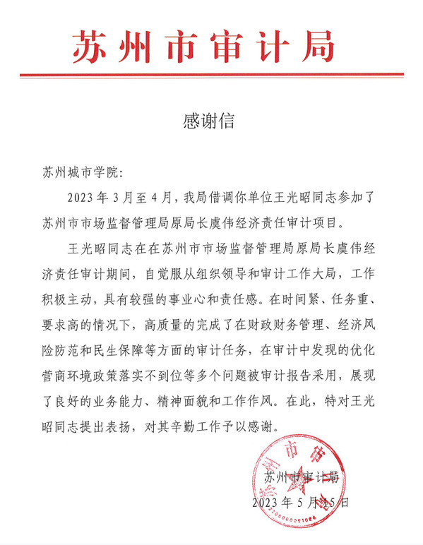 近日,我校收到苏州市审计局寄来的感谢信,对审计处王光昭同志表示感谢和慰问。
