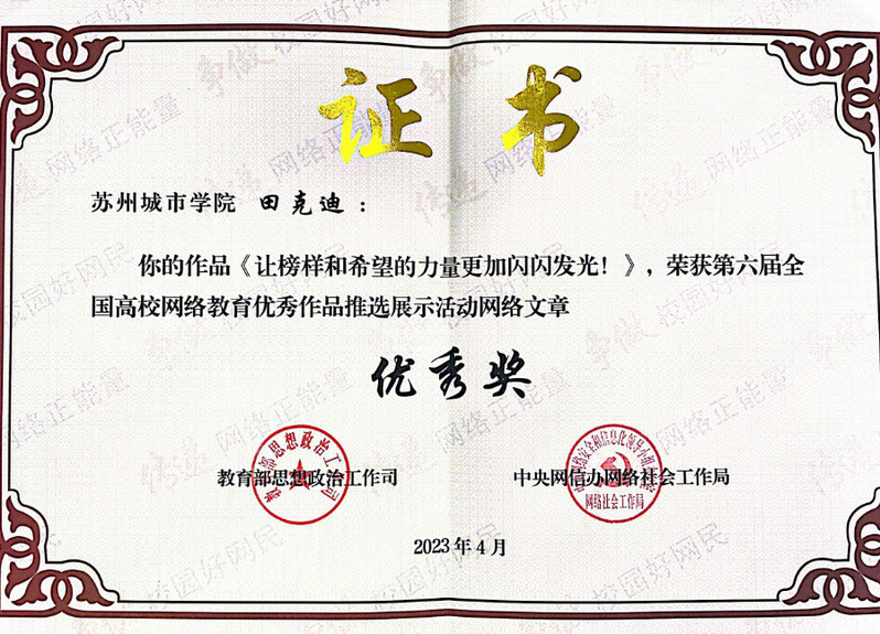 近日,教育部公布了第六届“全国大学生网络文化节”和“全国高校网络教育优秀作品推选展示活动”遴选结果,我校党委学生工作部(处)田克迪老师的作品《让榜样和希望的力量更加闪闪发光》在全国高校网络教育优秀作品推选展示活动中荣获优秀奖。