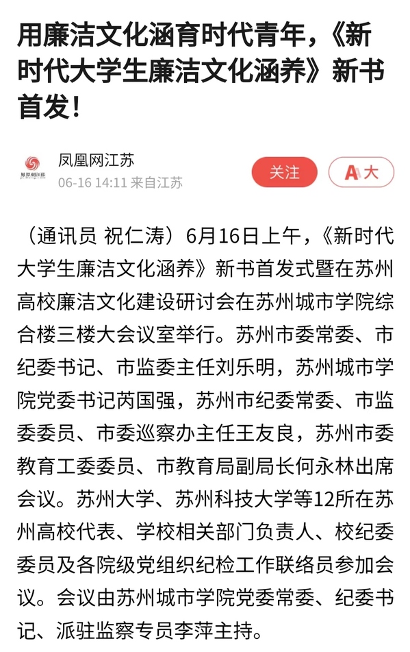 “苏州城市学院将继续打造‘廉洁城院’,借助思政课程,将廉洁文化教育与理想信念教育、纪法教育、警示教育有机衔接,充分发挥教育治本功能,涵养‘不想腐’的内在自觉。坚持正面引导和无形熏陶相结合,让青年学生感悟廉洁、体验美好,充分发挥廉洁文化成风化人、润物无声的教育引导作用。”芮国强表示,这次组织编写出版发行《新时代大学生廉洁文化涵养》,倡议成立在苏州高校廉洁社团联盟,召开在苏州高校廉洁文化建设研讨会,是我们为加快推动廉洁苏州建设贡献高校力量的积极探索,更是坚持“立德树人”根本任务,全面推进“大思政课”建设的身体力行。
