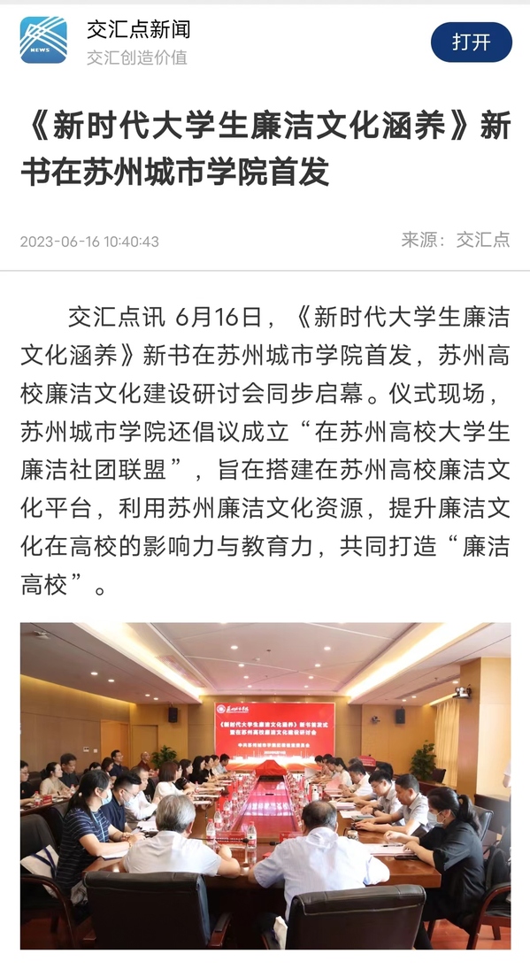 6月16日,《新时代大学生廉洁文化涵养》新书在苏州城市学院首发,苏州高校廉洁文化建设研讨会同步启幕。仪式现场,苏州城市学院还倡议成立“在苏州高校大学生廉洁社团联盟”,旨在搭建在苏州高校廉洁文化平台,利用苏州廉洁文化资源,提升廉洁文化在高校的影响力与教育力,共同打造“廉洁高校”。
