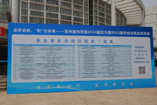 为深入贯彻落实党中央、国务院和省委、省政府“稳就业”“保就业”决策部署,进一步保障我校2023届毕业生的就业落实情况,同时提升2024届毕业生的就业能力,学习用人单位人才需求的必要知识,了解岗位工作实际和职业发展前景,促进人才供需结合,我校于6月15日下午举办“逐梦启航,‘职’引未来——苏州城市学院2024届实习暨2023届毕业生就业双选会”。