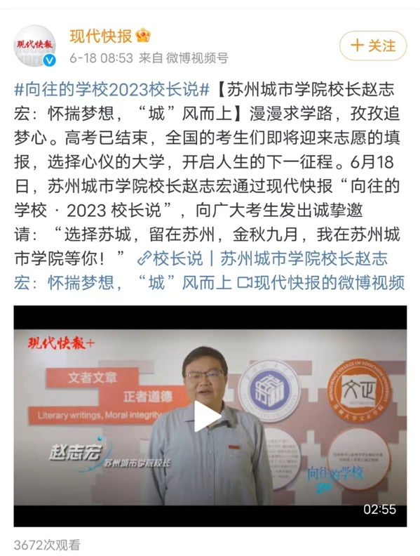 漫漫求学路,孜孜追梦心。高考已结束,全国的考生们即将迎来志愿的填报,选择心仪的大学,开启人生的下一征程。6月18日,苏州城市学院校长赵志宏通过现代快报“向往的学校 · 2023 校长说”,向广大考生发出诚挚邀请:“选择苏城,留在苏州,金秋九月,我在苏州城市学院等你!”