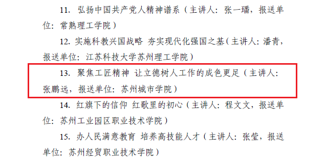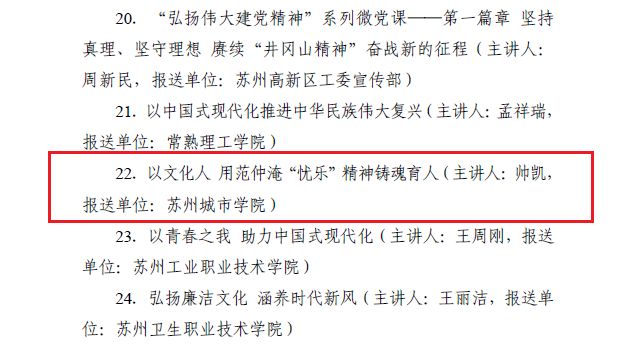 近日,中共苏州市委宣传部、组织部发布《关于2022—2023年度全市“众说学习:我是冬训主讲人”项目评价及冬训创新案例的通报》(苏宣通〔2023〕24号)。在我校党委宣传部、党委学生工作部(处)、马克思主义学院等部门的认真组织、广泛动员下,我校党员积极响应。经全校遴选,共报送3件作品进入推选展示平台,其中张鹏远老师主讲的《聚焦工匠精神让立德树人工作的成色更足》荣获第一等次,帅凯老师主讲的《以文化人用范仲淹“忧乐”精神铸魂育人》荣获第二等次。