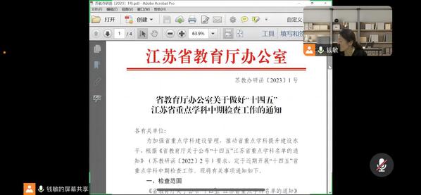 钱敏首先就苏教办研函〔2023〕1 号文件向相关领导、老师们进行了传达,然后对照重点学科建设任务书和重点学科中期检查报告梳理了相关的工作任务和工作要求,就中期检查的具体流程和时间节点进行了讨论,并确定了相关的工作计划。高雷强调中期检查是学院完成重点学科建设的重要环节,是检验学院综合实力和学科水平的重要标志。各位教师和工作人员要充分认识到任务的紧迫性和重要性,深入研究省教育厅的通知文件,明确中期评估的指标和要求。与会人员纷纷表示,将积极投入到中期检查的准备工作中,排除万难,努力做好各项任务。
