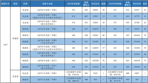 今年我校进一步优化生源结构,加大省内计划投放数量,省内招生计划1794人,考生报考关注度和热情保持良好态势,生源数量稳定、质量较好,一次性投档计划满足率100%。录取美术类专业考生95名,其中历史等科目类考生70名,物理等科目类考生25名;录取普通类考生1699名,其中历史等科目类考生711名,物理等科目类考生988名。各院校专业组投档线较去年保持平稳,其中历史类01院校专业组在增加计划的情况下仍有所提升;物理类09院校专业组上涨幅度较大,在同类型院校专业组别中保持领先。各院校专业组录取分数线位次排名情况详见下表。