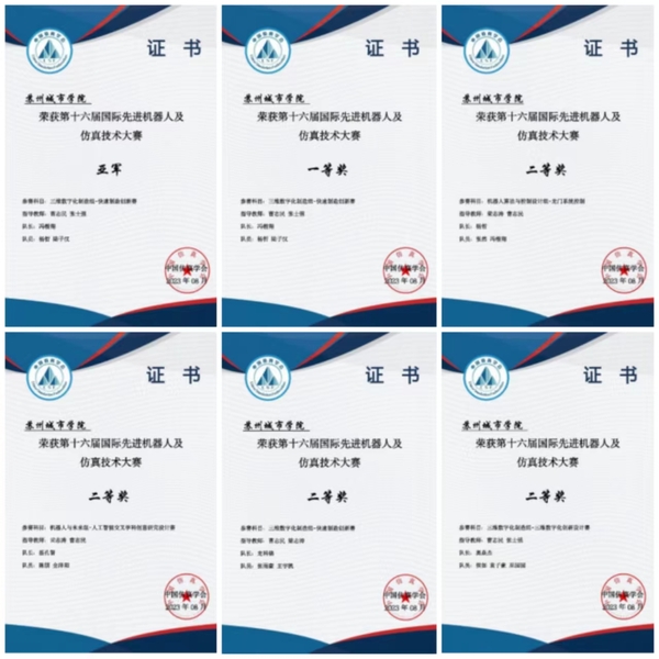 近日,由中国仿真学会、国际水中机器人联盟、太仓市人民政府、西北工业大学共同主办的第十六届国际先进机器人及仿真技术大赛在江苏省太仓市落下帷幕。经过省赛(区域赛)选拔出的来自包括中国科学院大学、上海交通大学、西安交通大学、浙江大学、哈尔滨工业大学、大连理工大学、东南大学等国内知名高校206支队伍参加国赛现场决赛。经过现场激烈角逐,由智能制造与智慧交通学院教师张士强、梁志涛、曹志民指导的参赛队伍荣获国赛一等奖(全国亚军)1项、二等奖4项、三等奖5项。