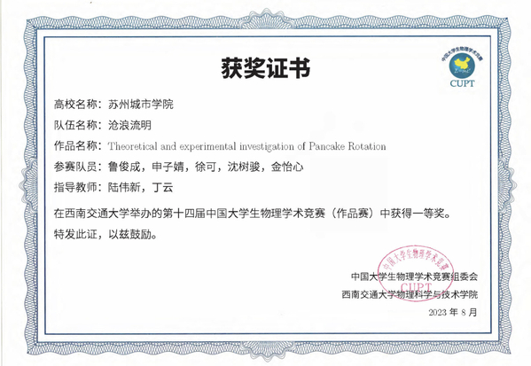 近日,在西南交通大学举办的第十四届中国大学生物理学术竞赛(作品赛)圆满落下帷幕。我校光学与电子信息学院“沧浪流明”团队的作品《Theoretical and experimental investigation 0f Pancake Rotation》荣获一等奖。团队成员有鲁俊成、申子婧、徐可、沈树骏、金怡心等5名同学组成,由陆伟新、丁云老师指导。