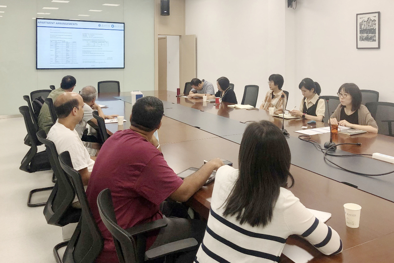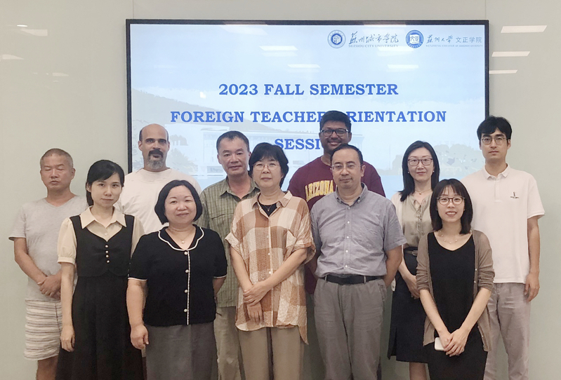 邓小玲代表苏州城市学院国际合作交流处欢迎各位外籍教师来校工作。潘涵就外籍教师在校教学与生活相关事项和行为规范作具体介绍与说明。