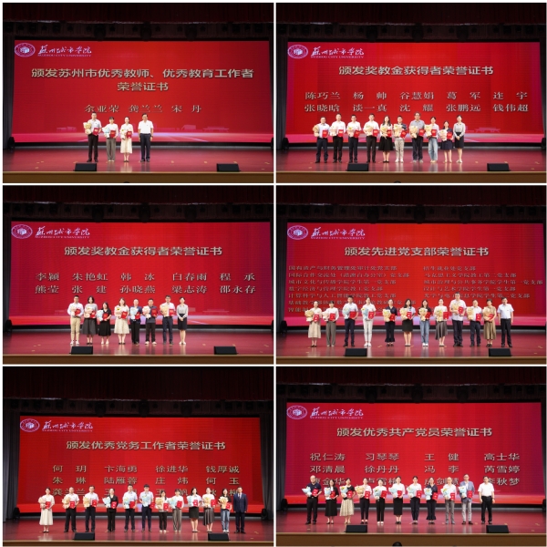 周玉玲宣读2022—2023年度苏州市优秀教师、苏州市优秀教育工作者,我校2023年建设银行奖教金,我校优秀共产党员、优秀党务工作者、先进党支部的表彰决定。党委常委、副校长周高颁发苏州市优秀教师、优秀教育工作者荣誉证书,党委常委、纪委书记、监察专员李萍颁发建设银行奖教金获得者荣誉证书,党委常委、副校长高雷颁发先进党支部荣誉证书,党委常委、副校长毛小勇颁发优秀党务工作者荣誉证书,党委常委、副校长吴昌政颁发优秀共产党员荣誉证书。