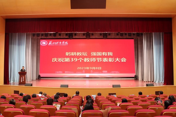 苏州市优秀教师、苏州市优秀教育工作者代表、计算科学与人工智能学院龚兰兰老师发言,她表示在日常工作、学习过程中始终记牢并努力实践好五个字:一是“硬”:专业过硬、教学基本工过硬;二是“精”:教师要学农民,尊重个性,精耕细作;三是“广”:有广博的学识、开阔的格局;四是“暖”:做个有温度的教师;五是“真”:以平等、真诚的心态与学生相处。学校建设银行奖教金获得者代表、设计与艺术学院熊莹老师与大家分享,作为一名教师要有责任心、耐心、好奇心和决心,并表示在今后的工作中,会常怀敬畏之心,继续保持学习者的状态,回应时代之需,迭代教学内容,提升教学能力,在高等教育的数字化转型过程中,始终坚守育人初心,争做“四有”好老师,朝“大先生”的目标砥砺前行。“两优一先”获奖代表、党委学生工作部(学生处)卞海勇老师表示苏州城市学院是大家共同的家园,作为学校育人共同体的一员,感恩一路有大家同行。他衷心希望学校各项事业蒸蒸日上、再创辉煌,感谢各位领导老师对教职员工的关心、支持和帮助,祝福大家节日快乐。