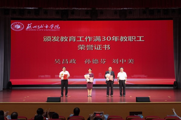 为进一步团结凝聚全校教职工为党育人、为国育才的初心使命,深入落实立德树人根本任务,根据苏教工〔2023〕43号《关于发放从事教育教学工作三十年荣誉证书的通知》文件精神,学校决定表彰一批从事教育工作满三十年的教育工作者。党委书记芮国强为吴昌政、孙德芬、刘中美三位老师颁发工作满30年教职工荣誉证书。