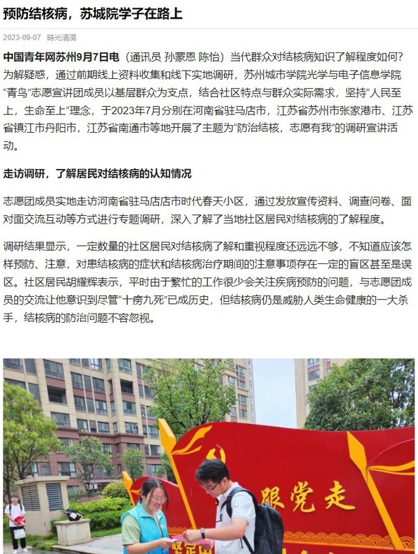 当代群众对结核病知识了解程度如何?为解疑惑,通过前期线上资料收集和线下实地调研,苏州城市学院光学与电子信息学院“青鸟”志愿宣讲团成员以基层群众为支点,结合社区特点与群众实际需求,坚持“人民至上,生命至上”理念,于2023年7月分别在河南省驻马店市,江苏省苏州市张家港市、江苏省镇江市丹阳市,江苏省南通市等地开展了主题为“防治结核,志愿有我”的调研宣讲活动。