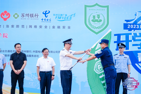 苏州市禁毒委员会副主任兼禁毒办主任、公安局副局长吴建伟为青盾行动讲师团授旗。2023年青盾行动正式起航,讲师团将为全市10余所高校7万余名大一新生们送去一场场集毒品预防、反诈防骗、治安防范、法律法规等综合性安全教育的开学第一课。