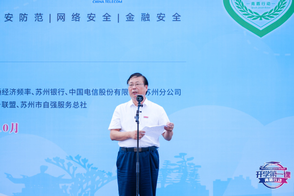 苏州市教育局副局长何永林,苏州市政法系统关心下一代委员会副主任兼秘书长刘善宏,苏州团市委权益部副部长吕纯宁,苏州市公安局吴中分局党委副书记臧政刚,苏州银行总行运营总监郑卫,中国电信苏州分公司副总经理顾栋胜,苏州市公安局新闻宣传中心政委邹巍,苏州市公安局禁毒支队政委谢文雷,苏州市公安局反电信网络诈骗支队副支队长娄乃成,苏州市公安局单位内部安全保卫支队副支队长周黎君也出席了仪式。