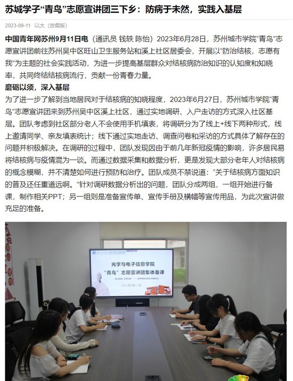 2023年6月28日,苏州城市学院“青鸟”志愿宣讲团前往苏州吴中区旺山卫生服务站和溪上社区居委会,开展以“防治结核,志愿有我”为主题的社会实践活动,为进一步提高基层群众对结核病防治知识的认知度和知晓率,共同终结结核病流行,贡献一份青春力量。