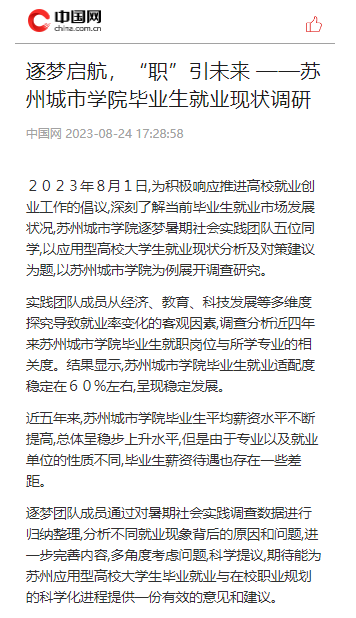 2023年8月1日,为积极响应推进高校就业创业工作的倡议,深刻了解当前毕业生就业市场发展状况,苏州城市学院逐梦暑期社会实践团队五位同学,以应用型高校大学生就业现状分析及对策建议为题,以苏州城市学院为例展开调查研究。